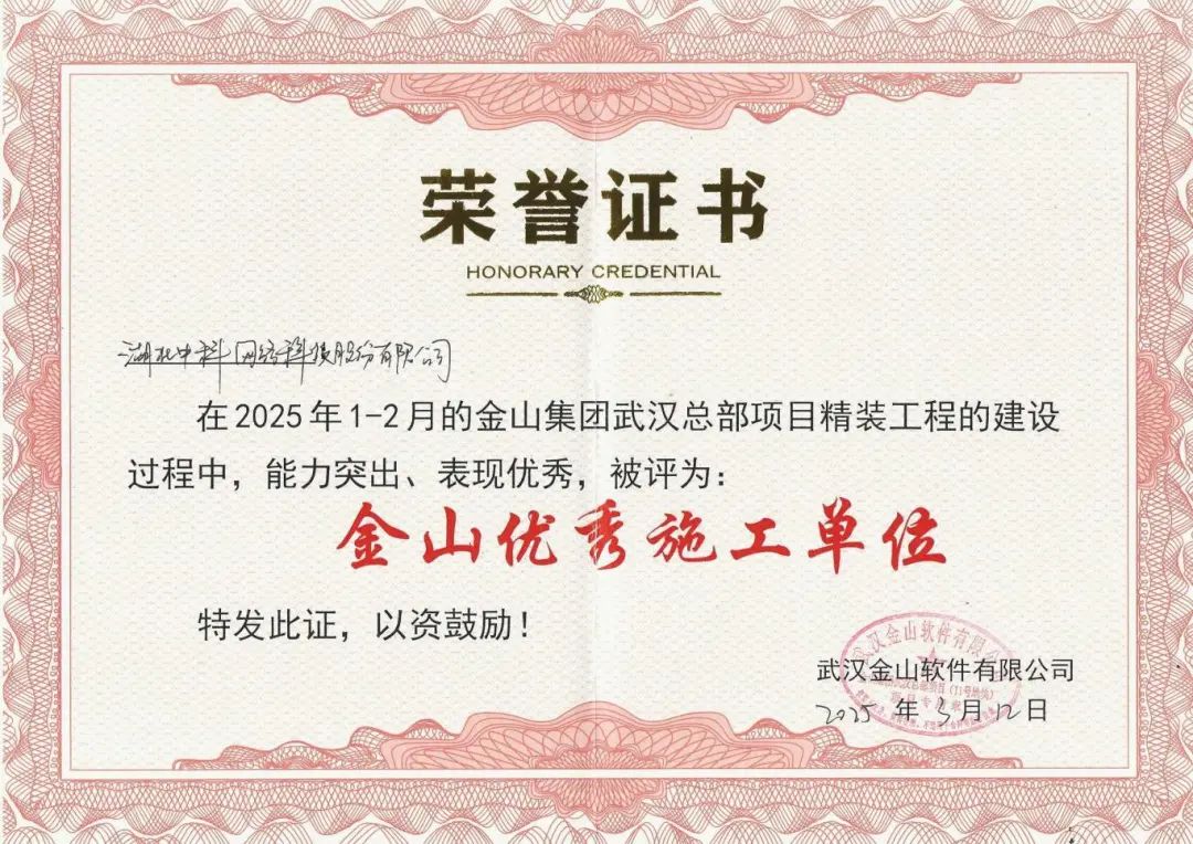 中科網(wǎng)絡(luò)榮獲“金山優(yōu)秀施工單位”,助力金山武漢總部精裝工程高品質(zhì)交付